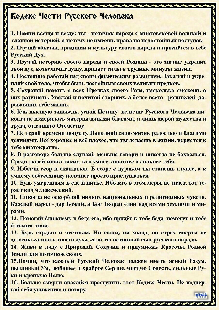 9. Всячески пресекать на корню любые попытки внешнего и внутреннего врага, нанести какой либо вред Российскому народу и России в целом;